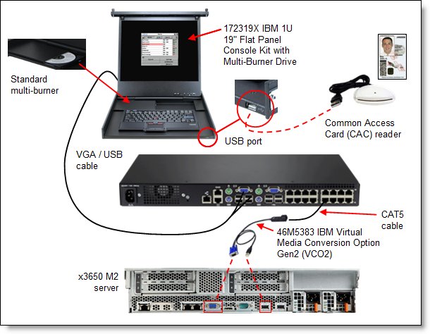 Note that USB ports are assigned to a single virtual media session and cannot be independently mapped. This means you cannot map one USB device to one target system and another USB device to another target system. Use of smart cards to authenticate access The LCM8 and LCM16 switches allow you to use CCID-compliant smart cards to ensure access is authorized. Smart cards are pocket-sized cards that store and process information and enable Two Factor Authentication (TFA). Smart cards such as the Common Access Card (CAC) can be used to store identification and authentication to enable access to computers, networks, and secure rooms or buildings. Smart card readers are connected directly to the switch via one of the USB ports. Note: For smart card use, the target device must be connected to the console switch using the Virtual Media Conversion Option Gen2 (VCO2), part number 46M5383. Other conversion options such as the VCO are not supported with smart cards. The following figure shows how a smart card solution can be implemented. Here our Common Access Card (CAC) reader is connected to the USB Passthru Port of the 19-inch Flat Panel Console Kit. The CAC reader is effectively connected to the remote server by way of the LCM16 and the VCO2 conversion option.
